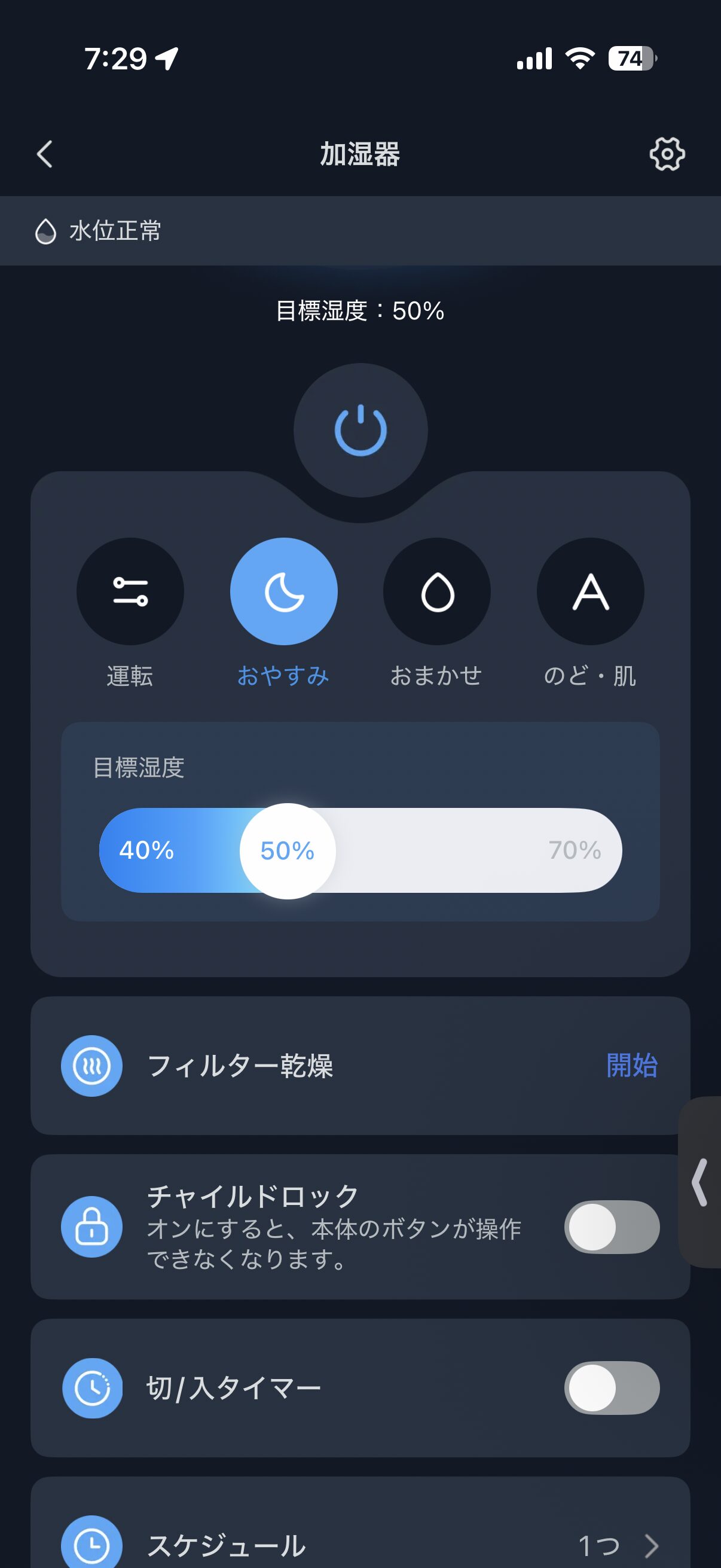 少し高めの設定にすることで、湿度を50%にしようと加湿機が働き、結果45%程度におさまっていました